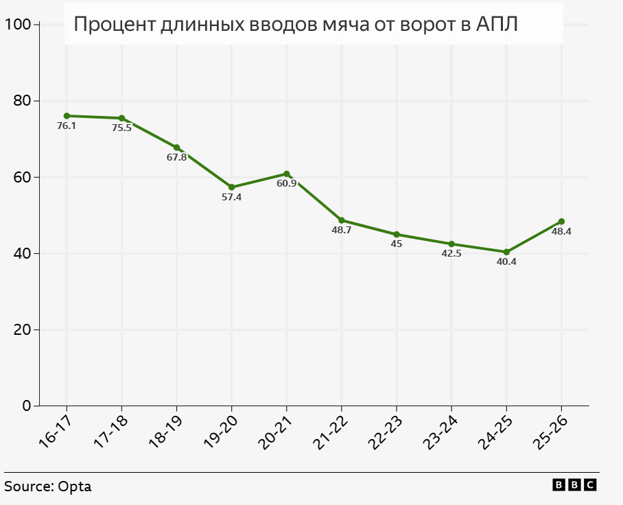 Согласно данным Opta, семь команд АПЛ, которые в прошлом сезоне чаще всего отдавали короткие пасы при розыгрышах от ворот, допустили более 30 ошибок, которые привели к ударам по воротам.